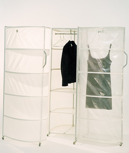 Foldable wardrobe in nylon fabric and steel tube with a flexible interior.